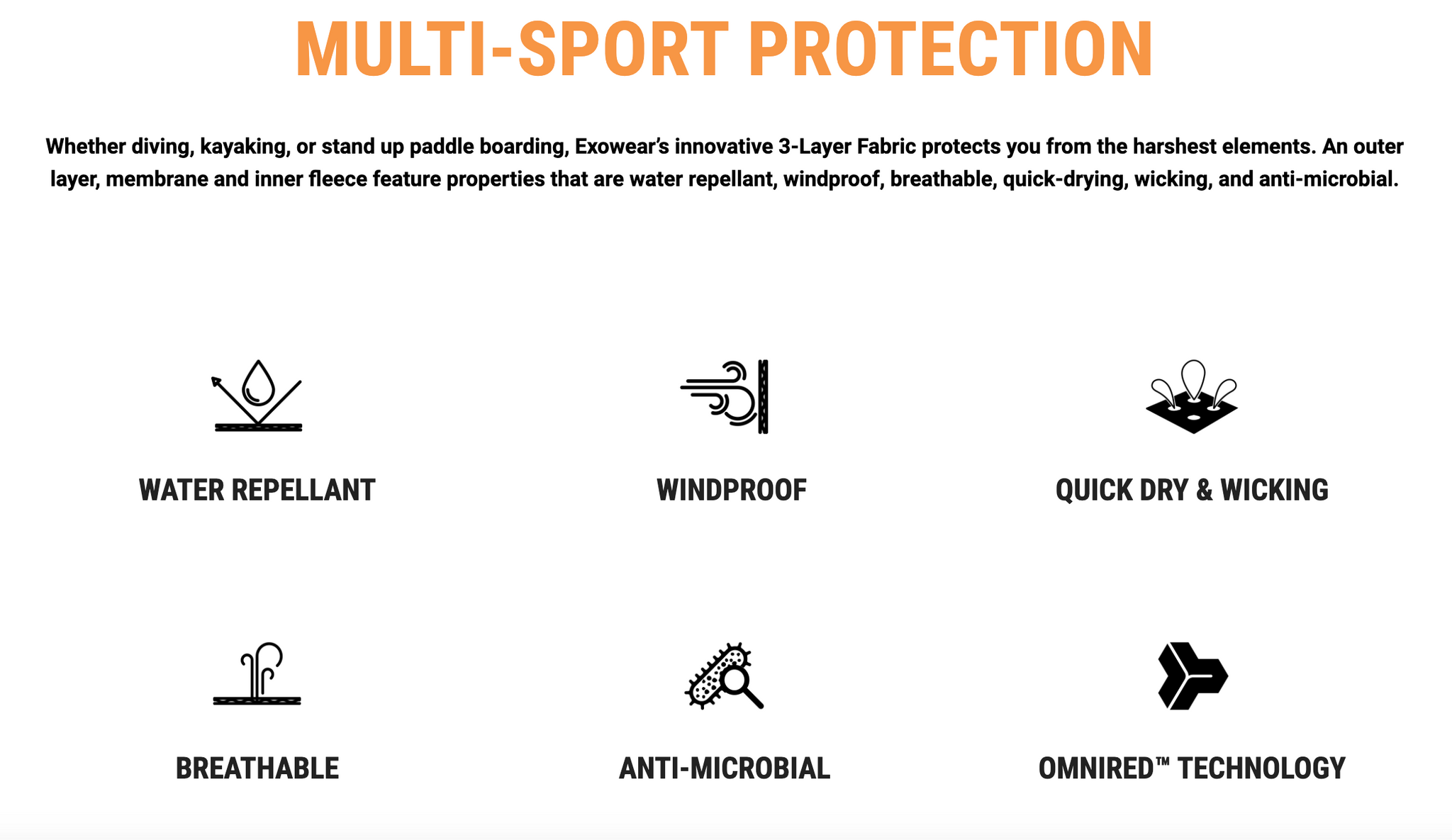 Exowear Full Suit provides the maximum thermal protection available in a neutrally buoyant exposure-protection garment and is designed for multi-sport use. OMNIRED™ Infrared Technology in the suit’s fabric converts your outbound body heat into infrared energy and reflects it back to your body for thermal warmth. 3-Layer Fabric protects from the harshest elements with materials that are water repellant, windproof, breathable, quick-drying, wicking, and anti-microbial. And because freedom of movement is essential in the water, Exowear’s 4-Way Stretch provides more elasticity and breathability than the 2-Way Stretch found in similar suits.