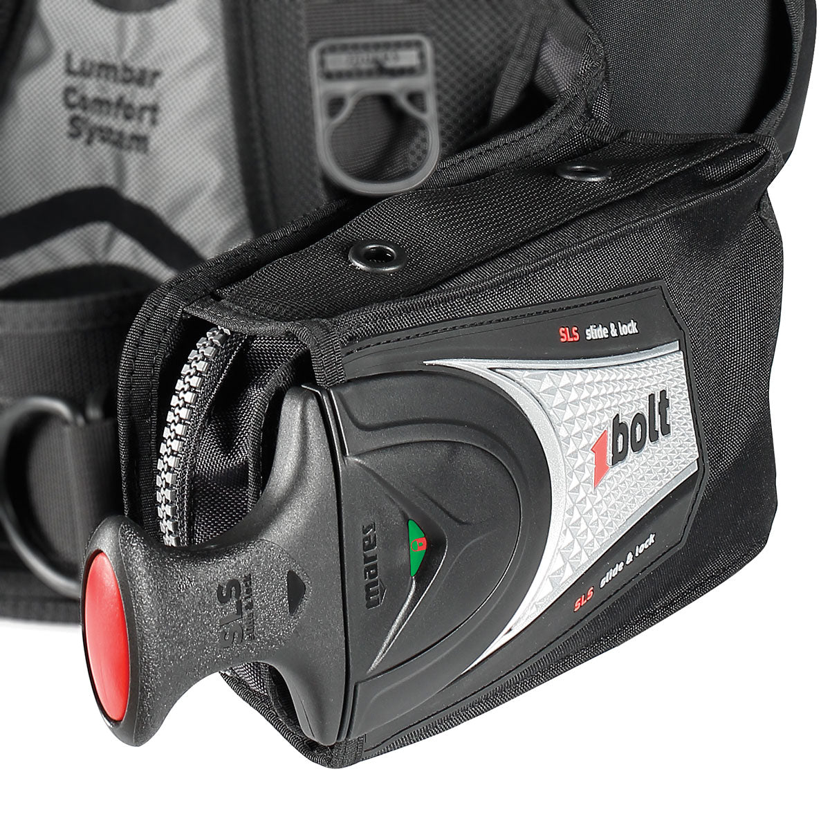 Superbly comfortable and stable back buoyancy BC provides 46 lbs. (21 kg) of lift capacity in size large yet is streamline and weighs only 8.6 lbs. (3.9 kg). Shoulder straps with swivel action buckle design, adjustable chest strap and a waist strap are all equipped with squeeze-style" side-release buckles that along with the adjustable cummerbund provide a custom fit and ease of donning/doffing. BCD provides storage when needed with its roll-down cargo pocket. The Bolt SLS BCD has Mares Slide & Lock System (SLS) for weight release. This unique weight integrated BCD provides a visual confirmation of proper weight pouch insertion, so there is no guessing when you do your pre-dive check before entering the water. In addition, the BCD is equipped with smart trim weight positioning for a balanced feel when diving.