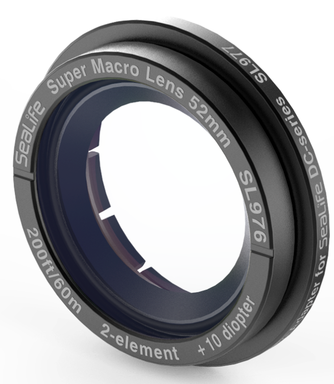 The Super Macro Lens captures stunning macro images from 1.5” to 4” (4cm to 10cm). The lens features a 2-element optical grade lens with anti-reflective coating and durable anodized aluminum construction on a 52mm press-on lens mount. This 52mm lens also attaches to any underwater housing with 52mm mounting threads.